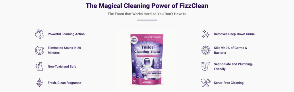 Rather than functioning as a harsh chemical solution, Fizz Clean is designed to support consistent bathroom maintenance, helping reduce visible stains and bacterial buildup over time while minimizing physical effort.